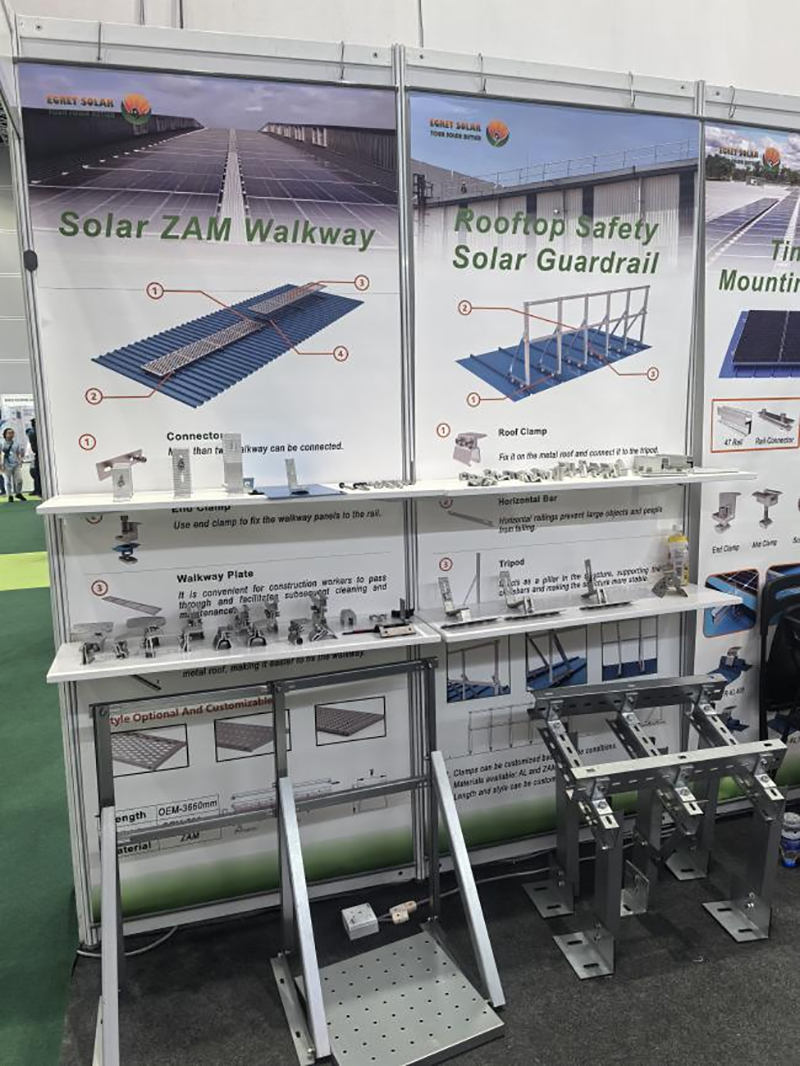 Di pameran itu, kami mempamerkan beberapa aksesori di atas bumbung, termasuk pengapit, cangkuk, dan kaki. Pelanggan boleh memilih kombinasi yang berbeza berdasarkan persekitaran pemasangan mereka. Pengapit atau kaki L digunakan untuk jubin keluli bersalut warna, manakala jubin bumbung suria solar digunakan untuk jubin seramik. Kami juga boleh menyesuaikan pengapit berdasarkan model jubin keluli bersalut warna pelanggan atau memperluaskan lengan cangkuk untuk disesuaikan dengan penggunaan di tapak.